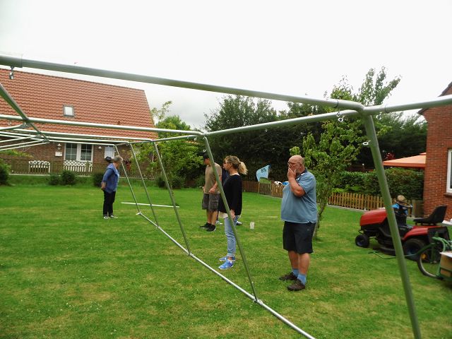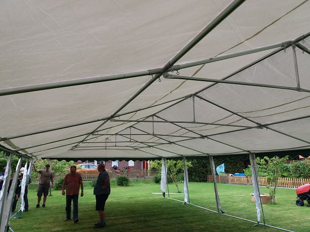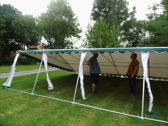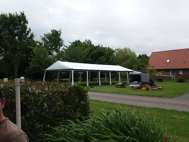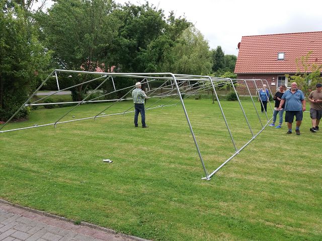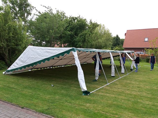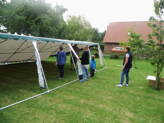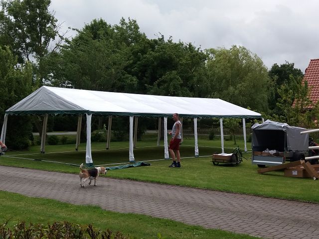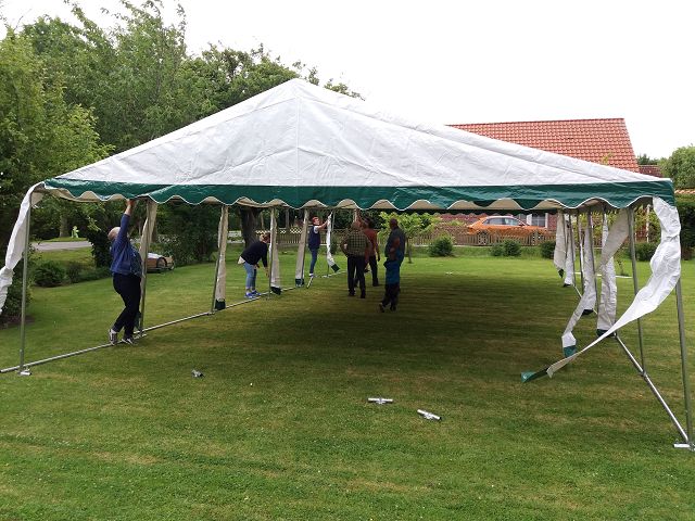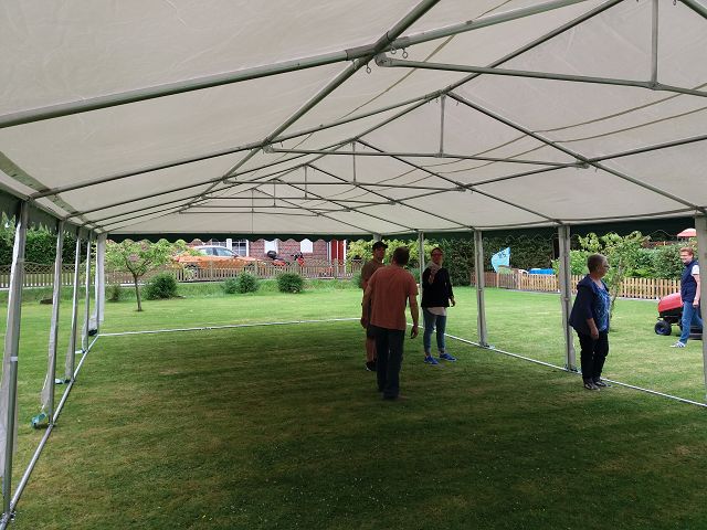 Unsere Dorfgemeinschaft hat beschlossen ein Zelt und einen Anhänger zu kaufen. Dieses Zelt wurde zur Probe am 08.07.2017 bei Jürgen Müller aufgebaut. Anschließend gab es für die Helfer noch eine Leckerei vom Grill.